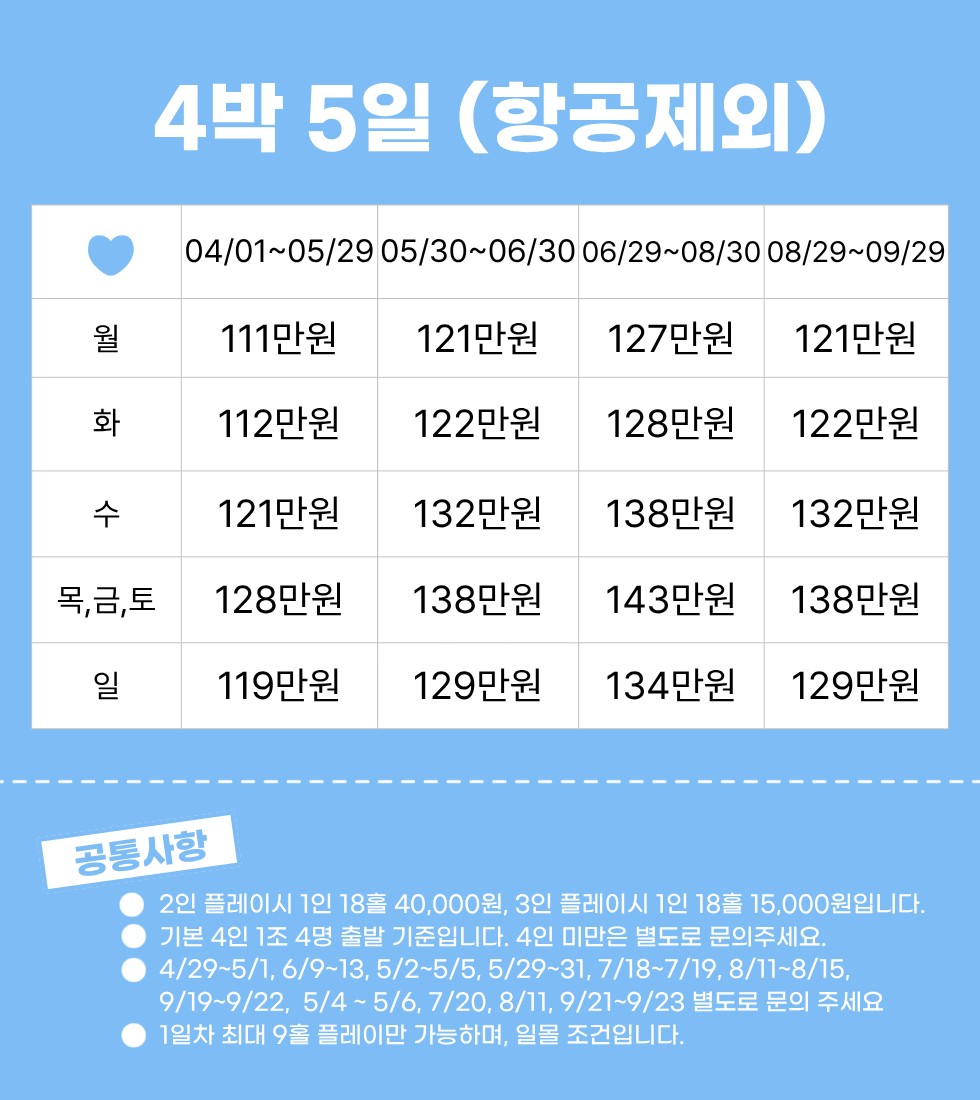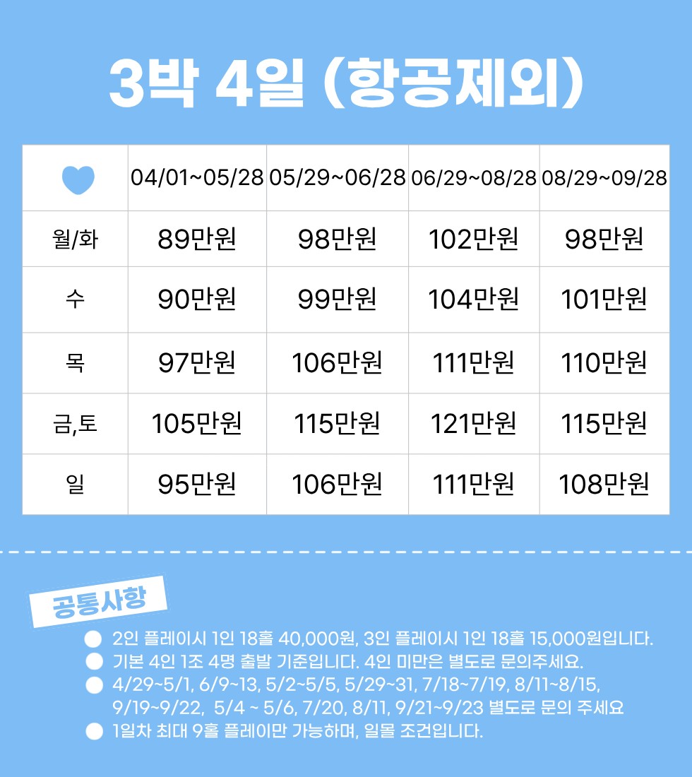 골프장 상황이나 날씨 등에 따라 이용 골프장이 변경될 수 있으며, 추가 비용이 발생할 수 있습니다.