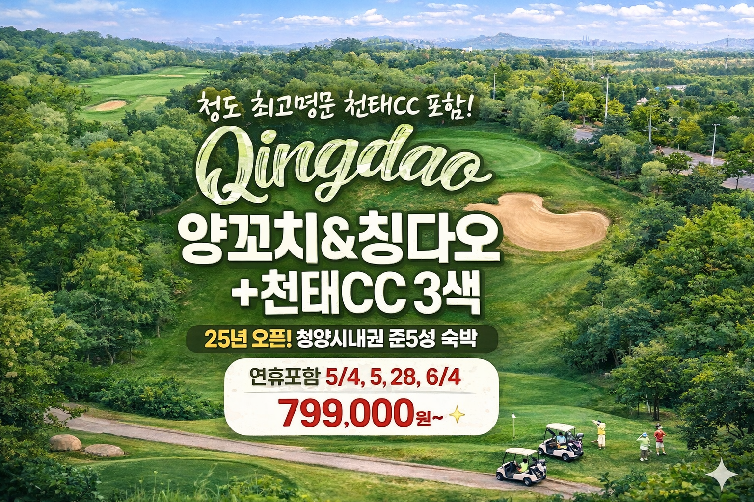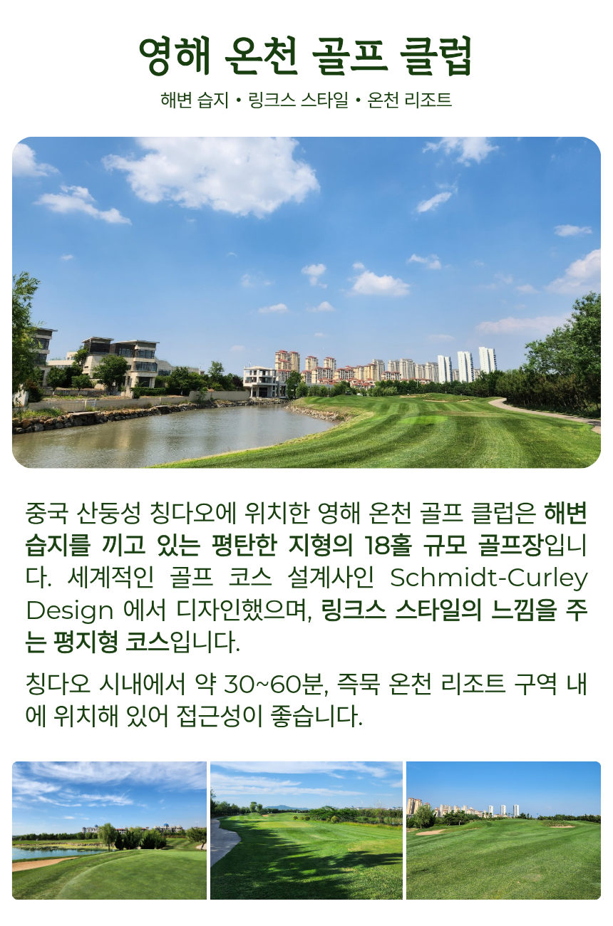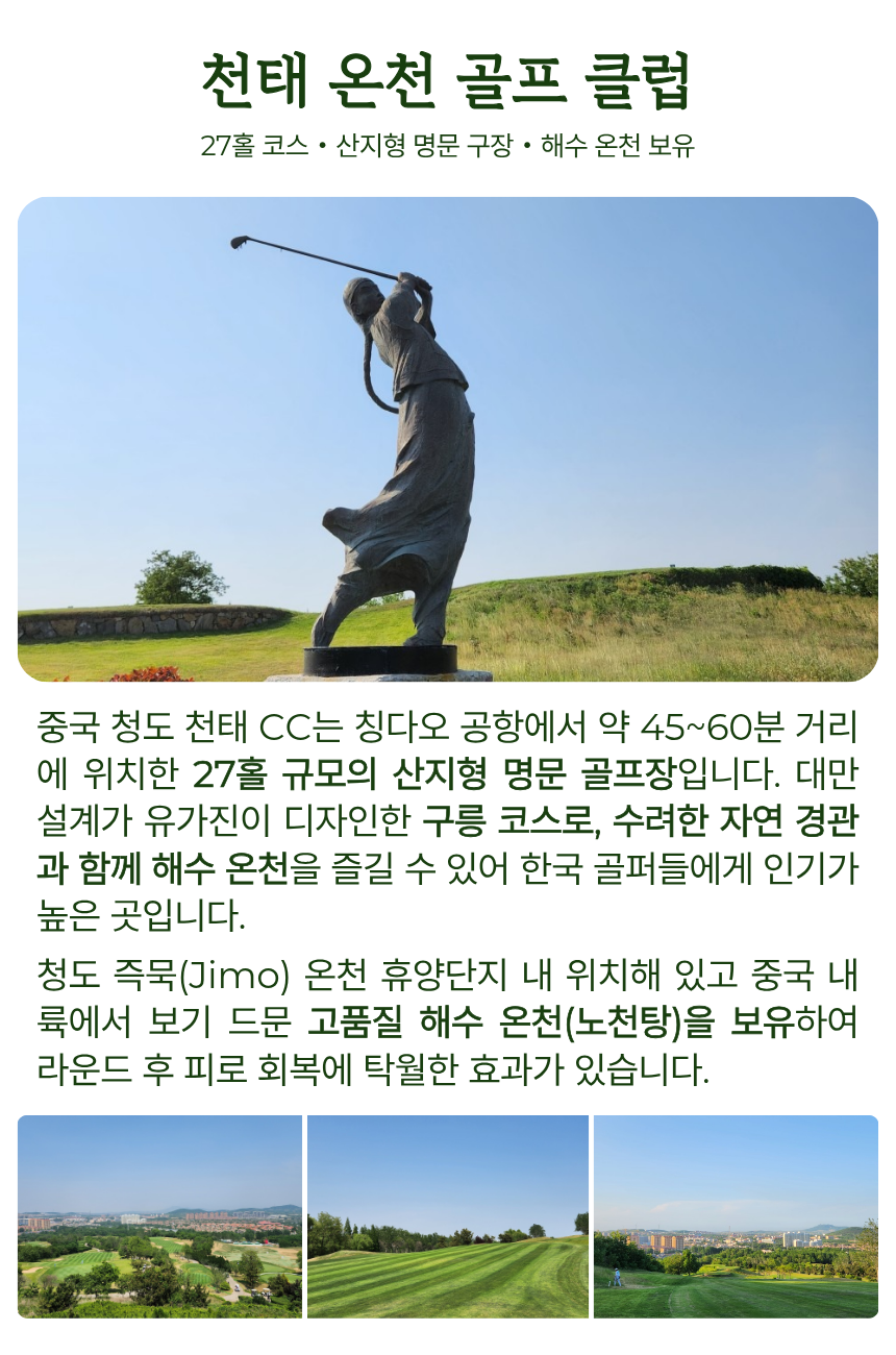청도 시내 쉐라톤 숙박과 3색 라운드, 그리고 양꼬치 특식까지 한 번에 즐기는 베스트 조합 상품입니다. 청도 최고 명문 멤버십 코스로 손꼽히는 천태CC를 포함해 영해CC, 화산CC까지 3색 라운드로 구성되어 있어 코스마다 다른 매력을 경험하실 수 있으며, 시내권의 신축 5성급 호텔 숙박으로 편안한 휴식까지 함께 누릴 수 있습니다.