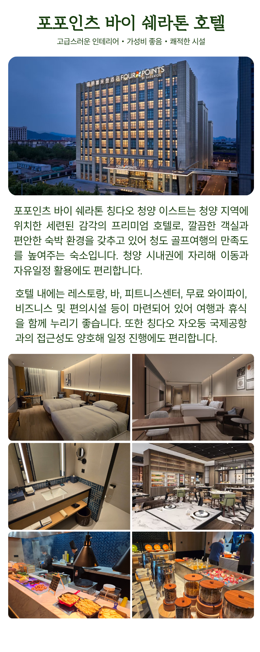 숙소는 포포인츠 바이 쉐라톤 이스트 청양으로, 청양 시내권에 위치해 이동과 자유일정이 편리하며 쾌적한 숙박 환경을 제공합니다. 여기에 청도를 대표하는 먹거리인 양꼬치 특식까지 더해져 라운드와 미식, 휴식이 모두 어우러진 만족도 높은 골프여행을 완성해드립니다.