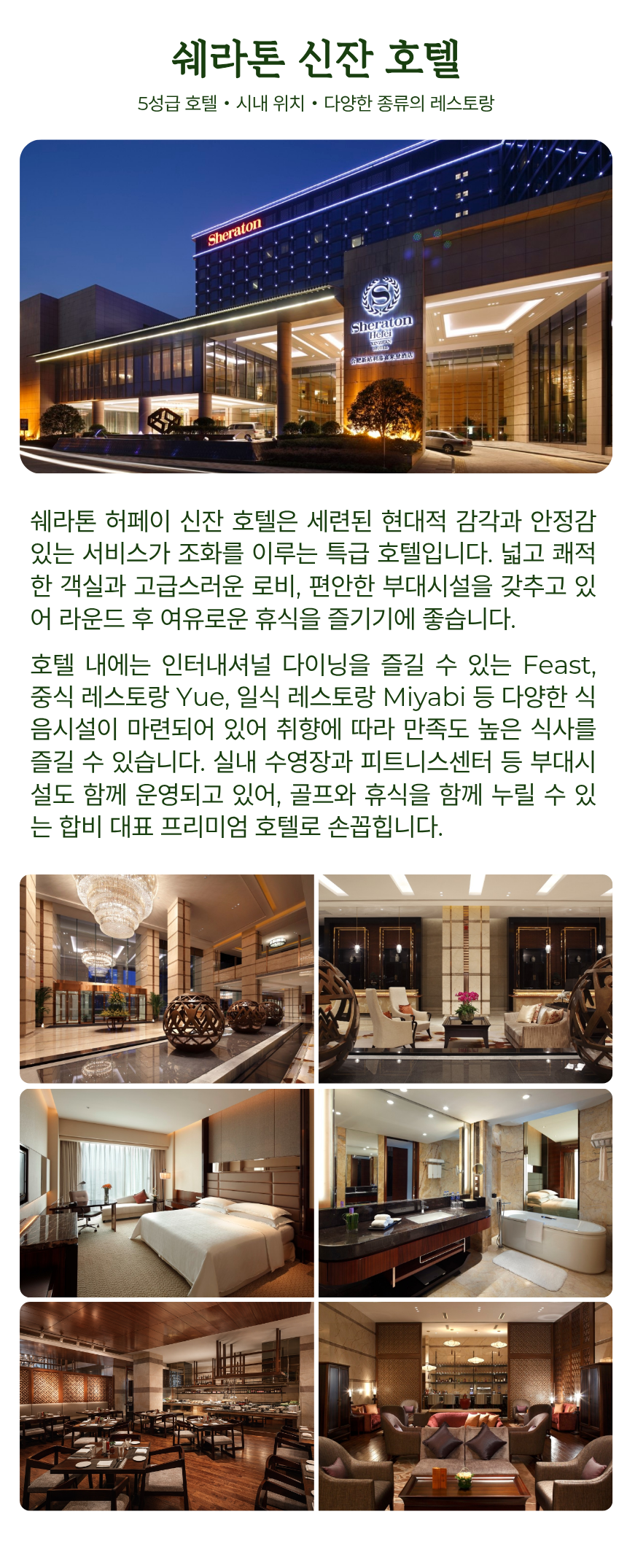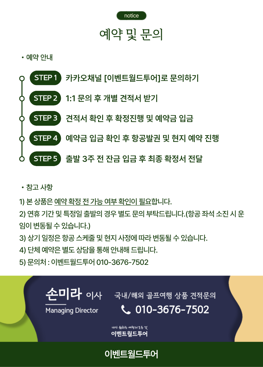 숙소는 5성급 쉐라톤 호텔로 편안한 휴식이 가능하며, 골프장은 이동 동선까지 고려한 일정으로 구성되어 라운드와 휴식을 균형 있게 즐기실 수 있습니다.