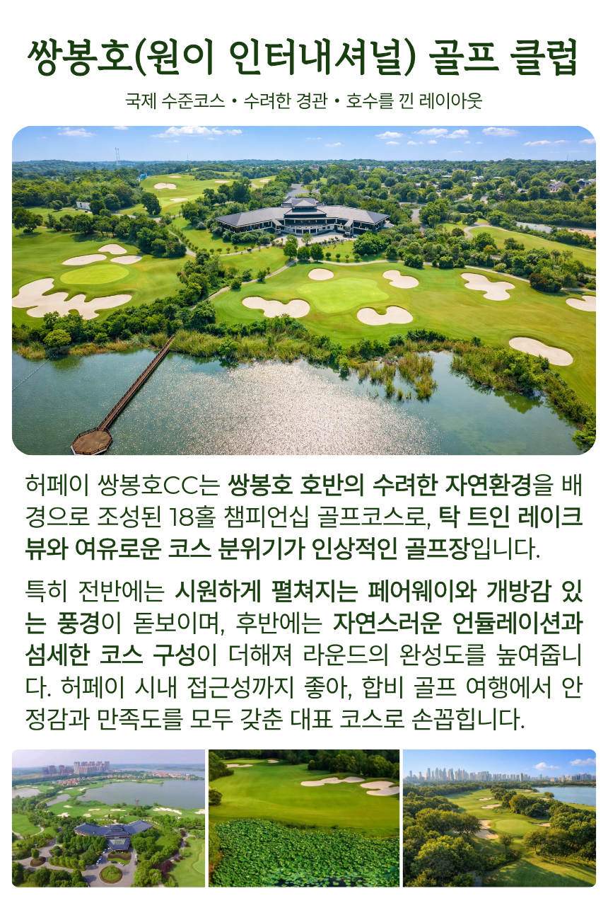 체류일에는 쌍봉호CC에서 본격적인 라운드를 즐기고, 추가 비용으로 자봉만 또는 남산흥무CC 변경도 가능해 2색 라운드의 재미까지 경험하실 수 있습니다. 봄 시즌 중국 골프를 찾는 분들께, 일정 선택의 폭과 편의성, 실속 있는 포함 조건을 모두 갖춘 만족도 높은 상품입니다.