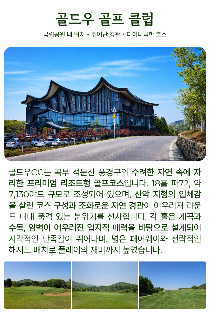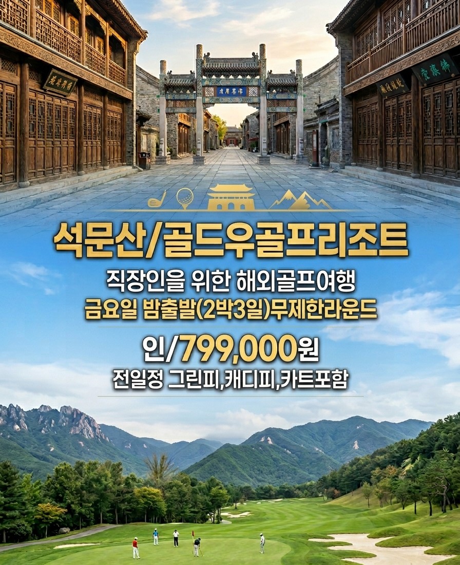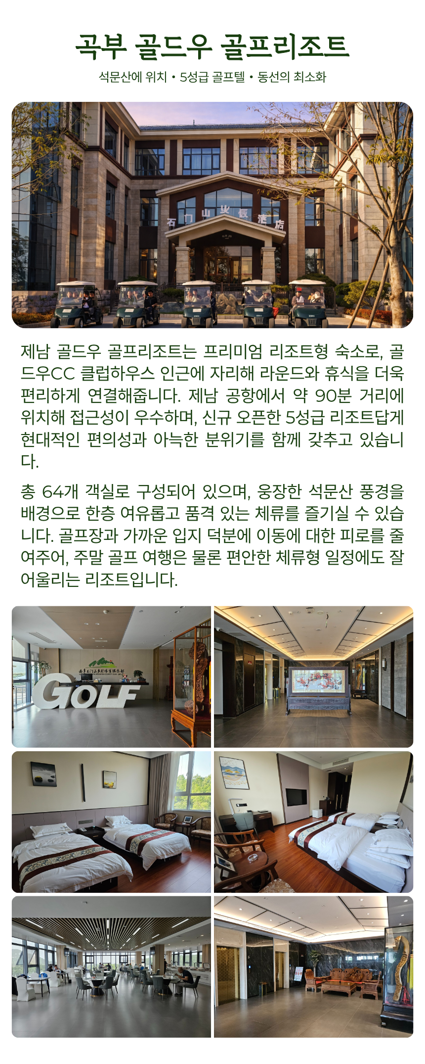 금요일 밤 출발 2박 3일 일정으로 떠나는 곡부 석문산/골드우 골프리조트 상품입니다. 공자의 고향 곡부에서 석문산CC와 골드우CC 무제한 라운드를 즐길 수 있으며, 항공, 숙박, 식사, 라운드, 현지 안내까지 알차게 포함되어 있어 편안하고 실속 있는 주말 골프 여행을 완성합니다. 2인부터 예약 가능하며, 레이트 체크아웃 포함으로 마지막까지 여유로운 일정이 가능합니다.