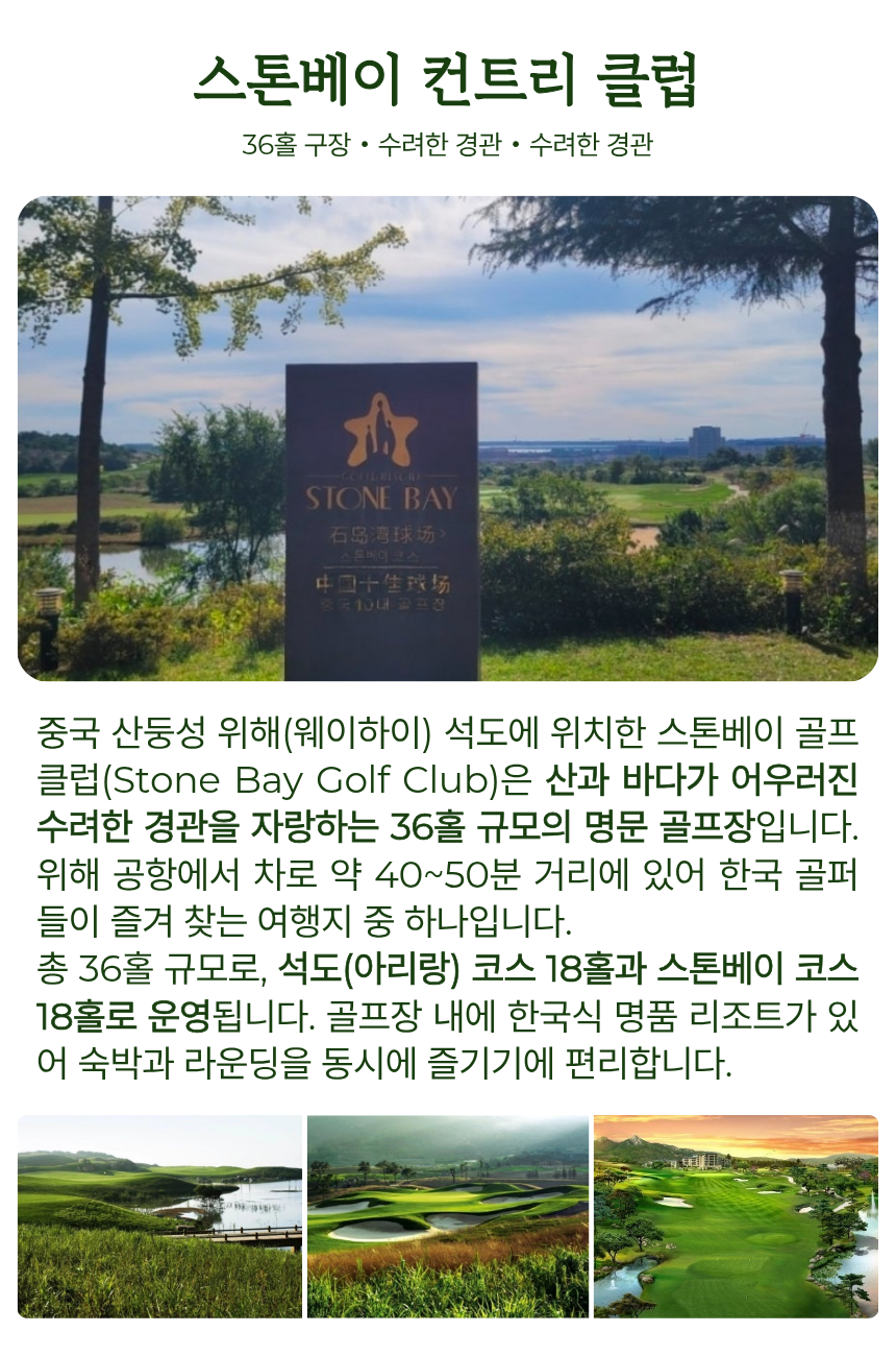 포인트CC는 쾌적한 코스 컨디션과 안정적인 레이아웃으로 편안한 플레이를 즐기기 좋으며, 천익CC는 여유로운 분위기 속에서 위해 골프 특유의 매력을 느낄 수 있는 코스로 많은 골퍼들에게 꾸준히 사랑받고 있습니다. 여기에 스톤베이CC는 세련된 코스 구성과 인상적인 풍경이 어우러져, 라운드의 완성도를 한층 높여주는 코스로 평가받습니다. 서로 다른 스타일의 3개 코스를 한 일정 안에서 경험할 수 있어, 다양한 코스를 선호하는 골퍼들에게 특히 만족도가 높은 구성이 될 수 있습니다.