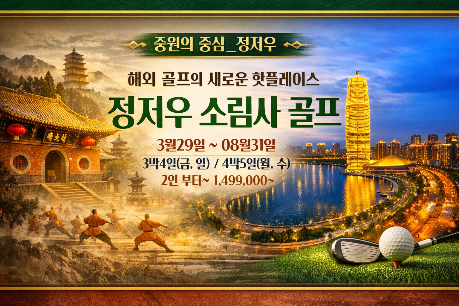 중국 무술의 본고장 소림사가 자리한 도시, 정저우에서 즐기는 감각적인 시티 골프 여행입니다. 대도시의 편리한 인프라와 여유로운 라운드 환경을 동시에 누릴 수 있는 상품으로, 2인부터 출발 가능해 부담 없이 떠나기 좋습니다.