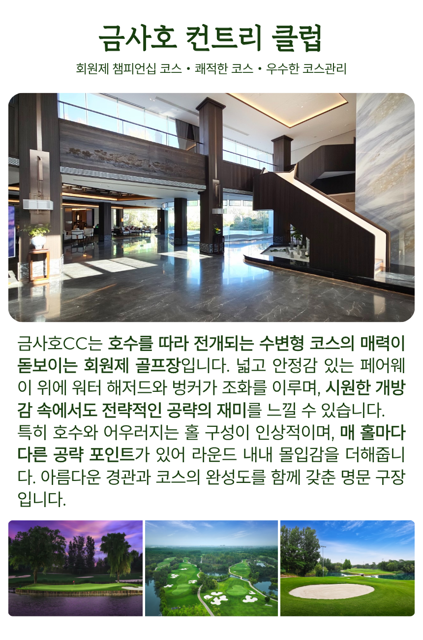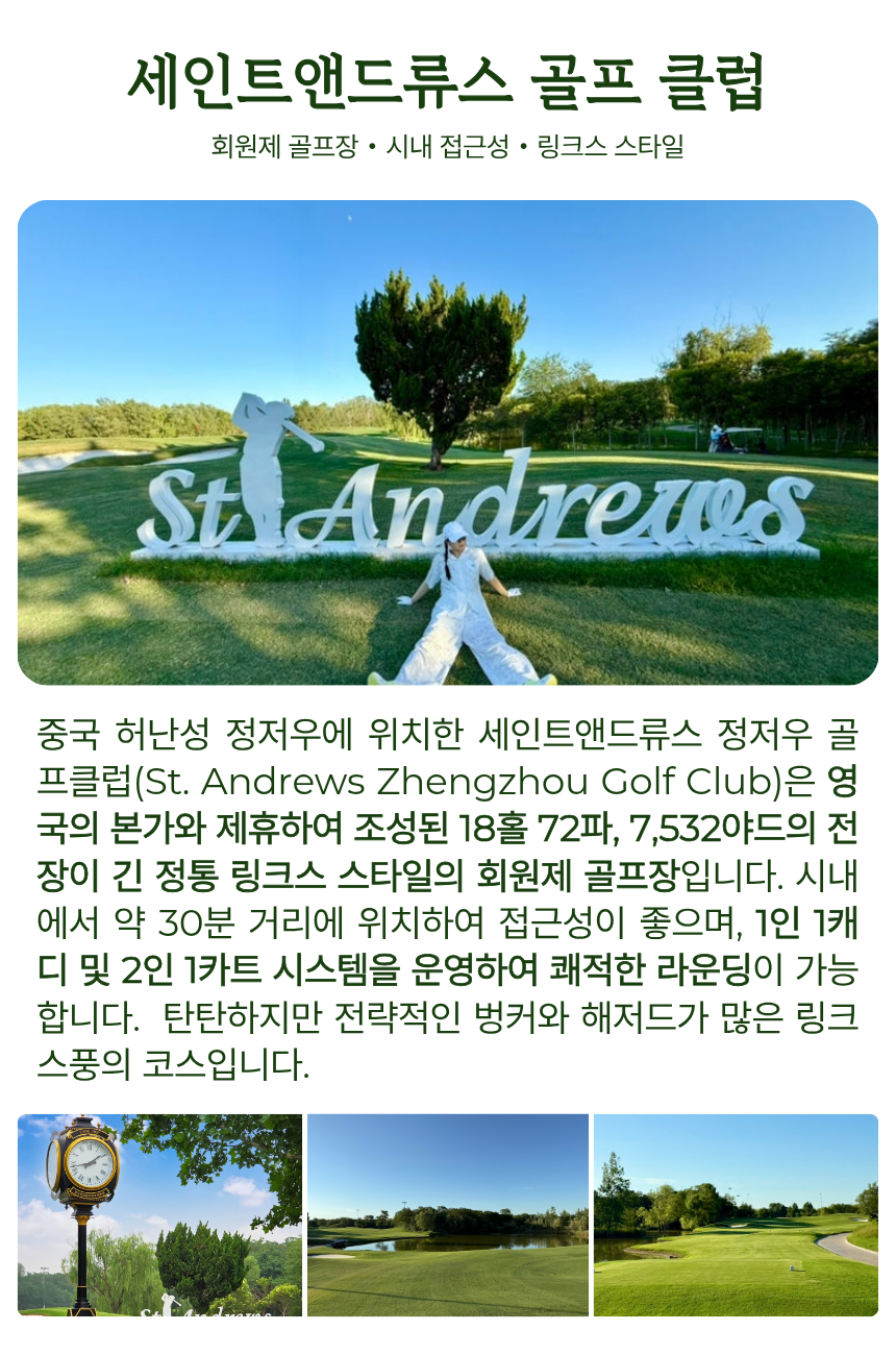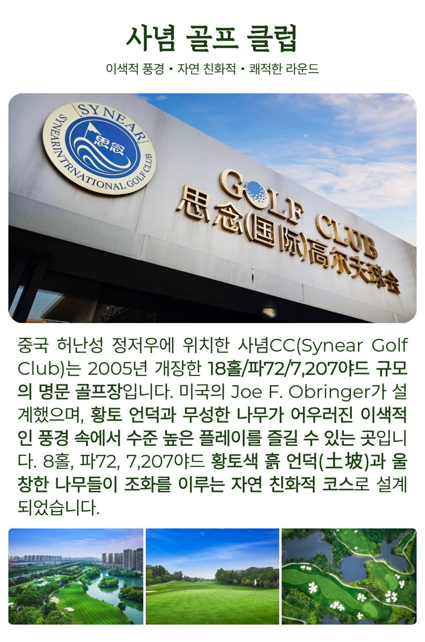 골프뿐만 아니라 보천대협곡 또는 소림사 관광도 선택할 수 있어, 라운드와 관광을 함께 즐기고 싶은 고객에게 특히 잘 어울리는 상품입니다. 여유로운 분위기 속에서 프라이빗한 해외 골프를 경험하고 싶은 분들께 추천드립니다.