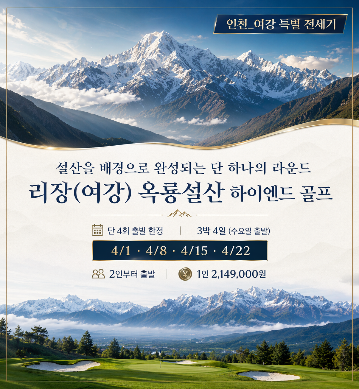 유네스코 세계문화유산 도시 리장(여강)에서 만나는 특별한 봄 시즌 골프 여행입니다. 인천–여강 특별 전세기로 더욱 편리하게 이동하고, 옥룡설산을 배경으로 펼쳐지는 시그니처 라운드와 여강 핵심 관광까지 함께 담아낸 하이엔드 골프 여정입니다.