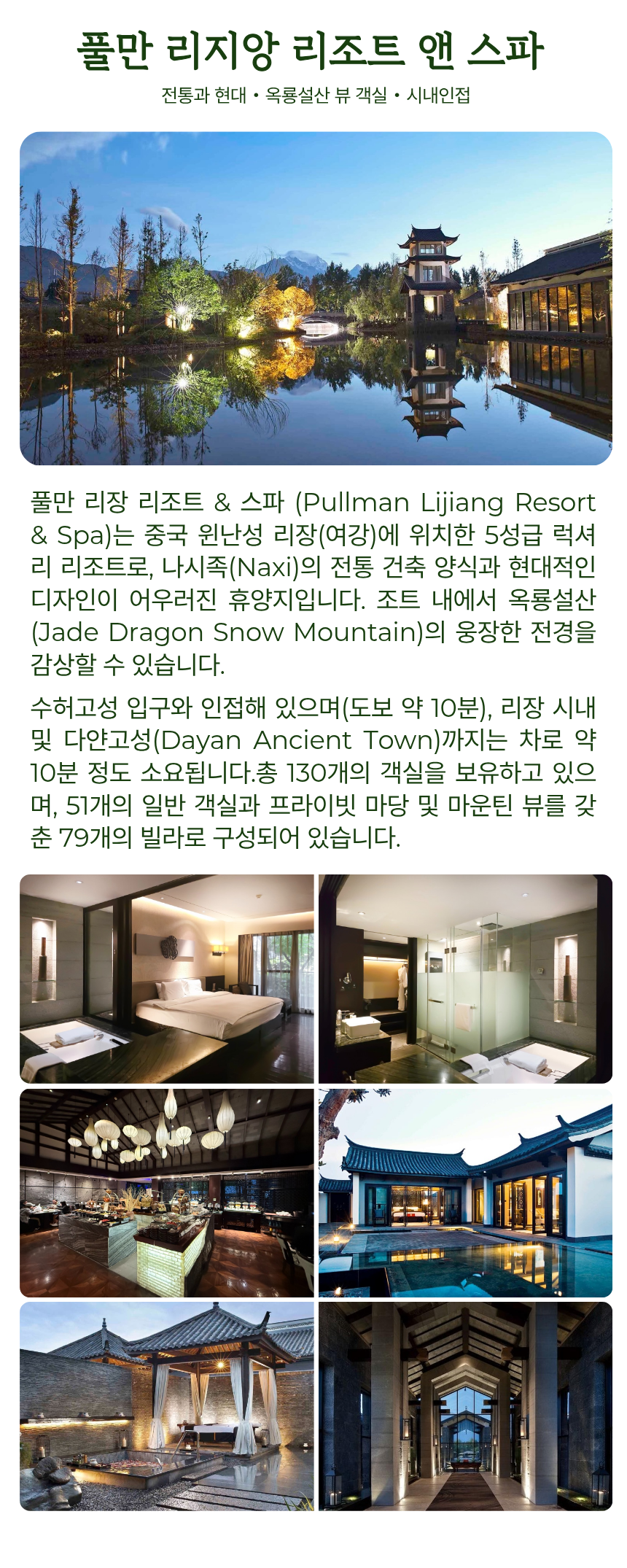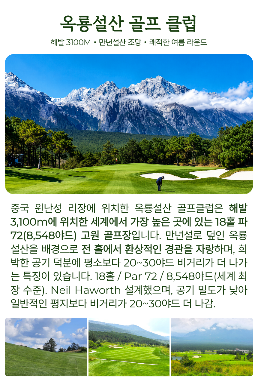 골프와 관광, 휴식이 균형 있게 구성되어 있어 여강의 자연과 문화, 그리고 상징적인 절경 라운드를 함께 경험하고 싶은 분들께 추천드립니다.