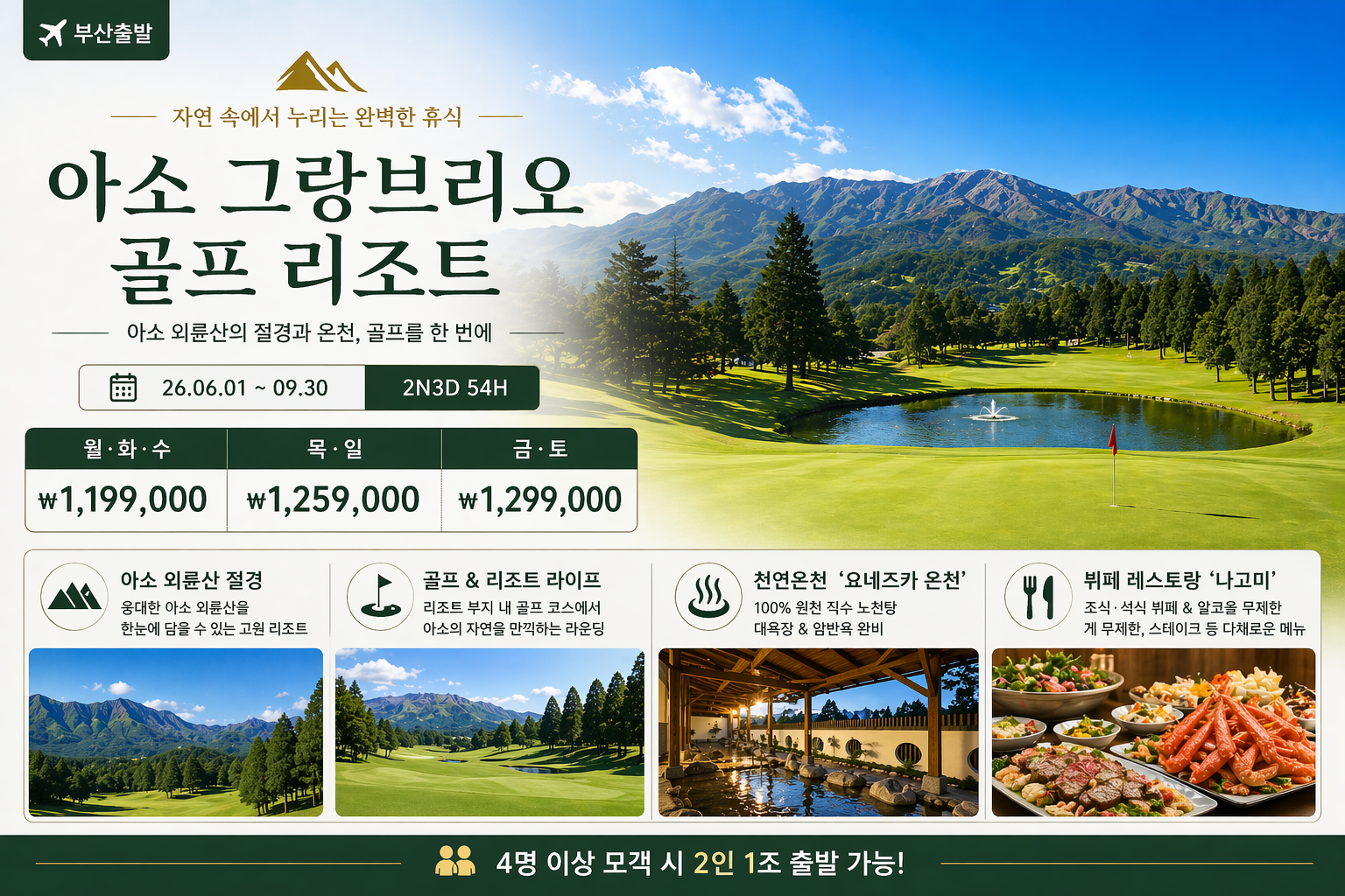 3인 플레이 시 3박 최저 추가 9,000엔 / 1인 1일, 9홀 추가 주중 3만원 / 주말 4만원 추가
