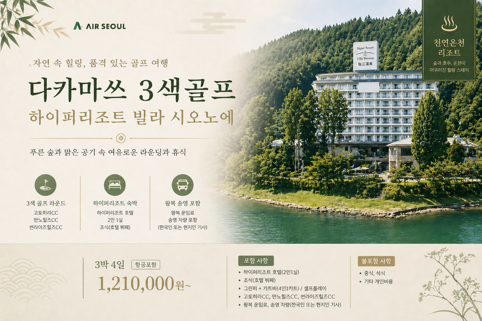 푸른 숲과 호수가 어우러진 자연 속에서 즐기는 다카마쓰 힐링 골프여행입니다. 하이퍼리조트 빌라 시오노에 숙박으로 조용한 리조트 분위기와 온천 휴식을 함께 누릴 수 있으며, 고토히라CC·만노힐즈CC·썬라이즈힐즈CC 3색 라운딩으로 알찬 골프 일정을 즐길 수 있습니다.